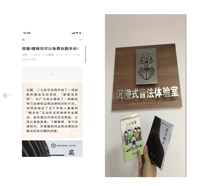 1、建立了全国首个沉浸式互动普法体验室。该项目结合了当下年轻人喜爱的“剧本杀”互动形式和律师专业释法,旨在通过沉浸式互动体验,让民众身临其境,了解案情,学习法律知识,并掌握如何运用法律知识解决实际问题的技能。河南法制报专程前来体验、直播、报道;河南工业大学新闻传播系专程前来体验并拍摄了新闻视频;看郑州、二七发布等多家官方媒体也都进行了报道。后期在樱桃沟玖涧园开设了“普法体验窑”,更好的方便群众体验学习。